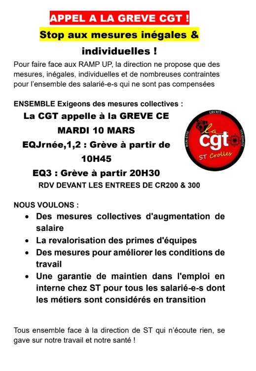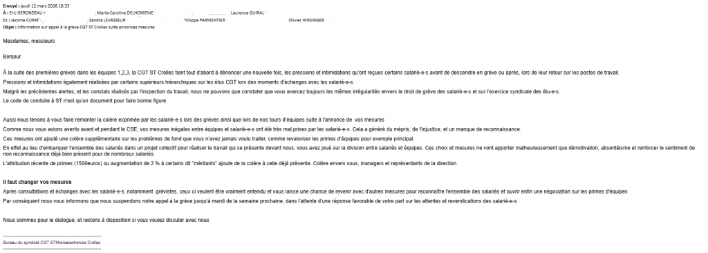 Grosse journée de grève surtout en manufacturing qui a été suivie par les équipes 1, 2 et 3 ce mardi 10 mars 2026 sur le site de Crolles (dans certaines équipes la moitié des CDI sont sortis).